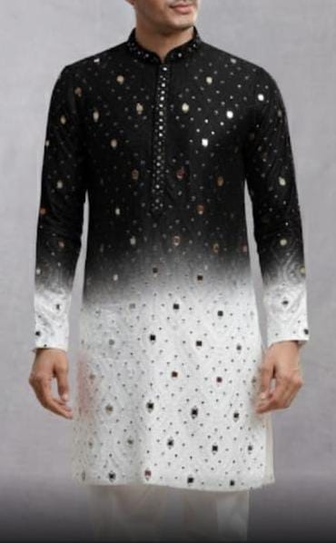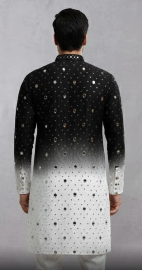 The Abhla Kurta Set is a bold expression of modern ethnic fashion, blending a classic silhouette with contemporary design elements. Crafted in a striking two-tone ombre effect, the kurta transitions smoothly from deep black at the top to soft white/ivory at the bottom, creating a dramatic yet elegant visual appeal.