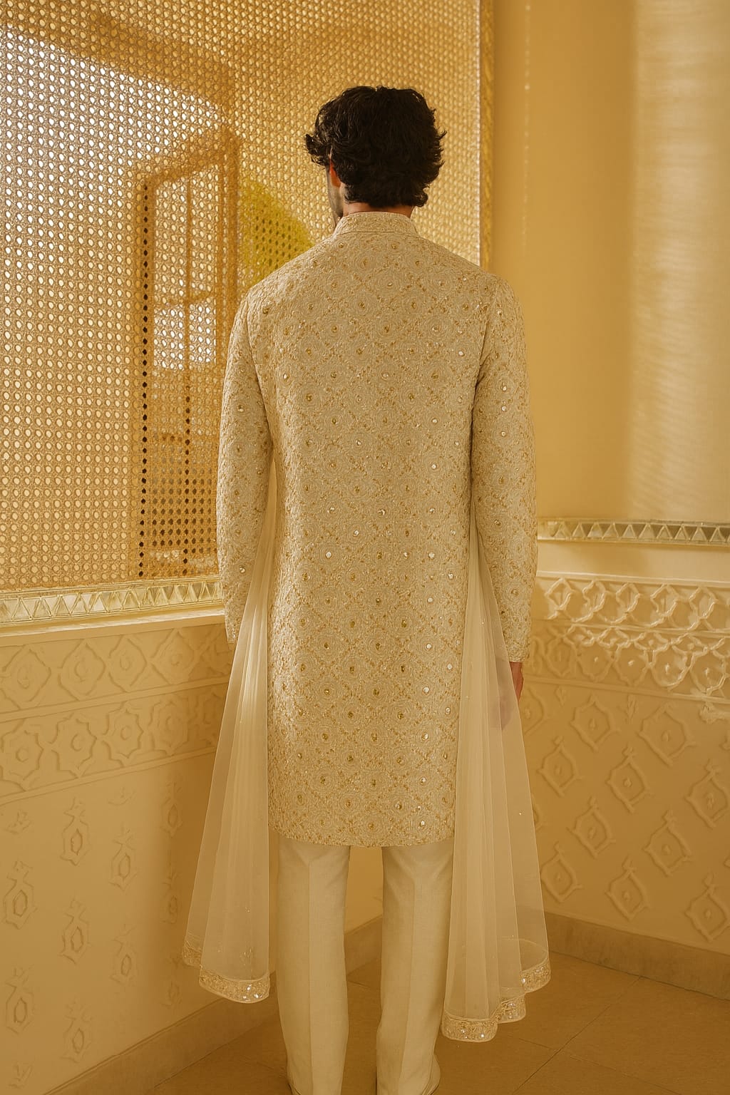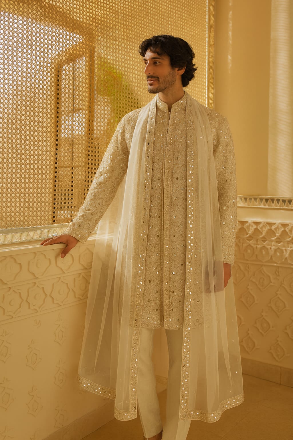 Intricate hand mirror work, delicately combined with resham and zari embroidery, adorns the ensemble, showcasing exceptional artisanal skill. The sherwani is paired with an inner kurta in fine cotton silk for comfort, while the look is completed with a soft net dupatta finished with hand-embellished borders—adding ceremonial elegance.