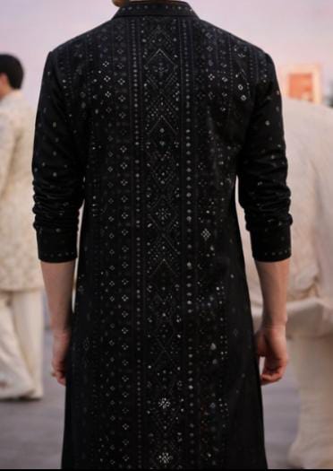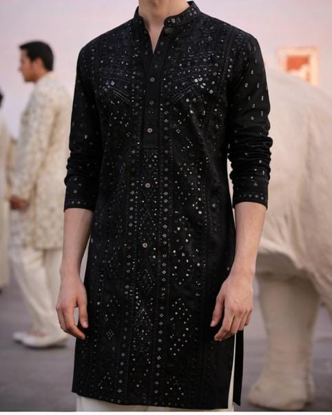 The rich onyx-black palette, complemented with charcoal highlights, creates a bold yet sophisticated aesthetic—perfect for evening occasions, festive gatherings, and cultural events. The classic straight silhouette ensures comfort and effortless movement. Paired with an ivory cotton silk bottom, the ensemble achieves a striking contrast while maintaining a premium handcrafted appeal.