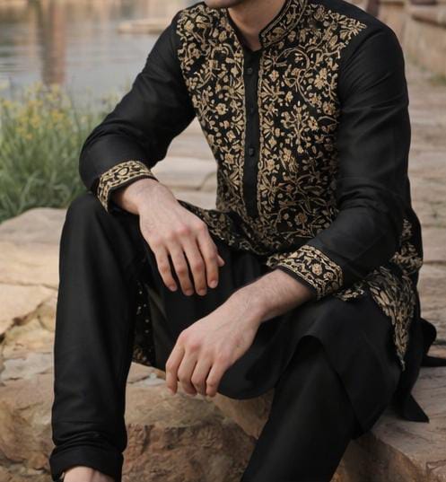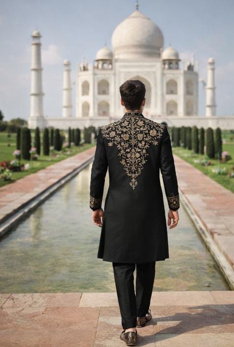 The meticulously embroidered front panel, collar, and cuffs reflect traditional floral geometry, while the heritage vine motif on the back adds a rare artisanal touch. Paired with a tailored cotton satin pajama for comfort and elegance, this set is ideal for festive evenings, cultural functions, and sophisticated celebrations.
