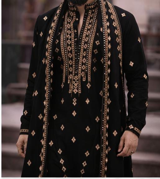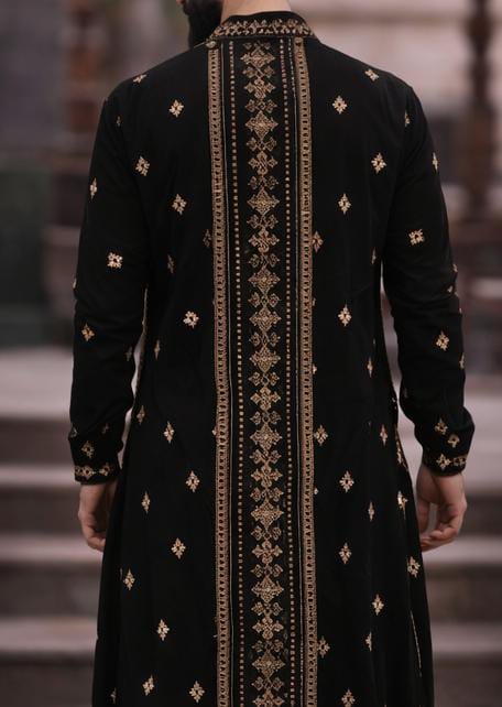 The Mughal Noir Sherwani Set is a regal ensemble crafted for grand celebrations and wedding occasions. Tailored from a luxurious silk-velvet blend, the sherwani features exquisitely detailed antique gold zari embroidery inspired by Mughal geometric and floral motifs. The matte black base enhances the richness of the gold, creating a striking contrast fit for royalty.