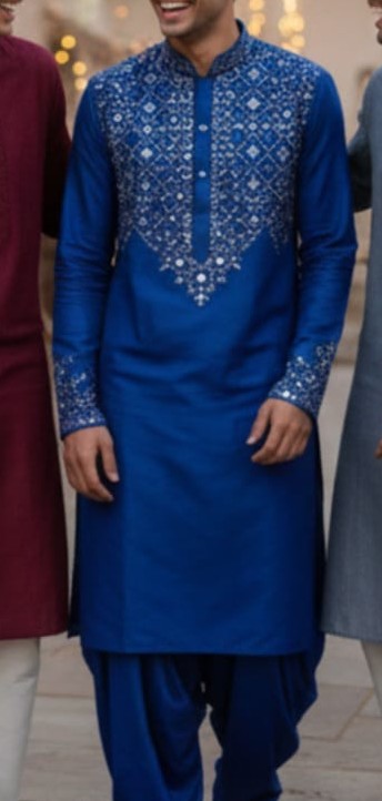 The royal indigo blue hue symbolizes depth, dignity, and cultural pride, while the breathable cotton lining ensures comfort throughout the day. Paired with a fluid cotton satin salwar, the ensemble offers ease of movement without compromising elegance.