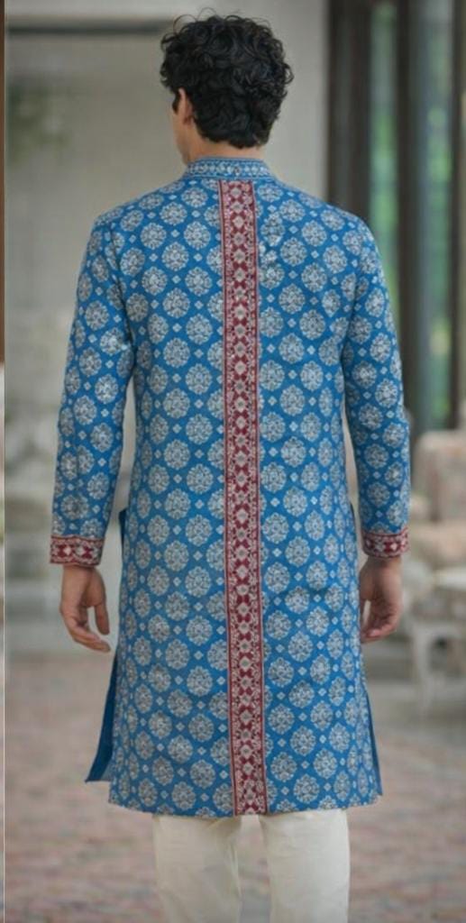 Inspired by age-old Bihari craftsmanship, the kurta features a hand block–inspired print adorned with delicate hand embroidery accents. Floral and geometric jaal patterns adorn the body, while the embroidered placket and contrast maroon border panel elevate the design. With full sleeves, embroidered cuffs, and a mandarin collar, this kurta balances cultural legacy with contemporary sophistication.