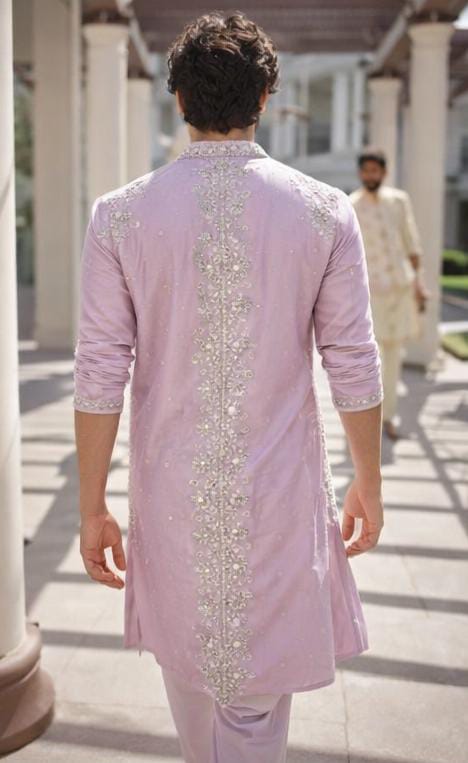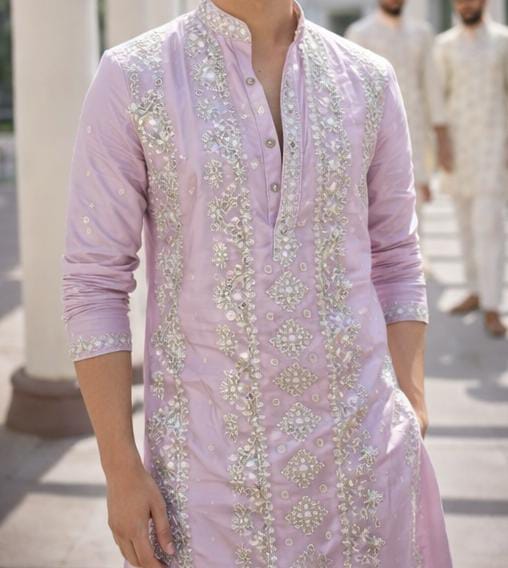 The pastel Gulabi pink hue exudes subtle charm, beautifully elevated with intricate hand-inspired floral and geometric embroidery, accented using delicate mirror and thread detailing. The Mandarin collar and embroidered placket lend a refined traditional touch, while the matching embroidered cuffs complete the sophisticated look.