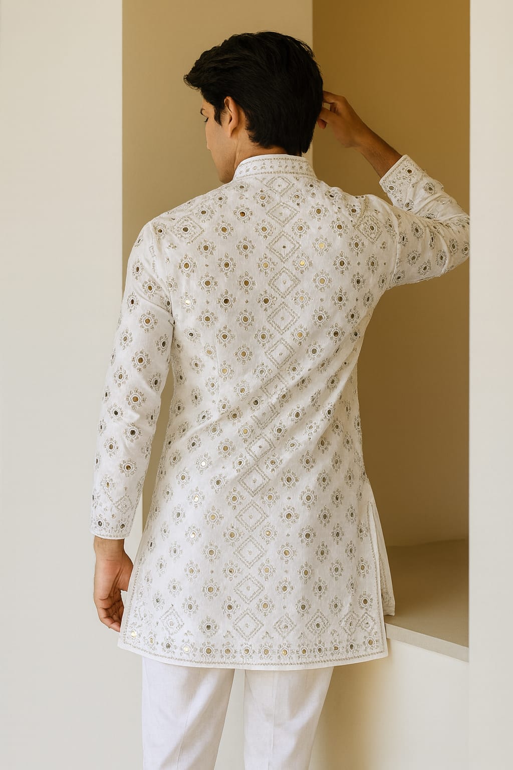 The soothing ivory hue enhances the intricate embroidery, allowing the mirror accents to subtly reflect light with understated grace. Designed with a relaxed yet structured silhouette, this ensemble ensures comfort while maintaining a polished, sophisticated look.