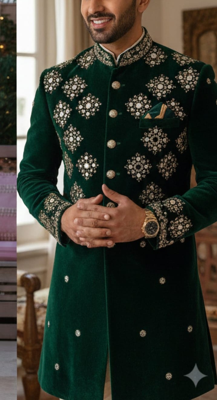 Raj Darbar Velvet Kurta – Emerald Green Zardozi & Resham Embroidery | Regal Festive Wear