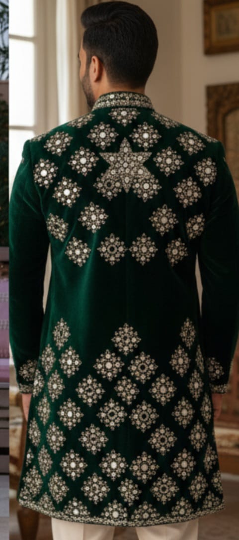Intricate handcrafted Zardozi and Resham embroidery, drawn from traditional geometric and floral motifs, adorns the kurta with antique gold detailing—creating a look that is both majestic and refined. The deep emerald green base enhances the richness of the embroidery, making this piece ideal for weddings, receptions, and grand festive occasions.