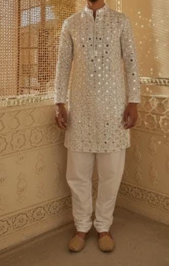 Intricate all-over geometric jaal motifs, created using fine resham embroidery and hand-applied mirrors, lend the kurta a rich yet balanced festive appeal. The fabric offers a smooth, breathable texture with a subtle sheen, ensuring comfort without compromising on sophistication.