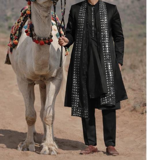 Ethically crafted in artisan clusters of Bihar, this sherwani celebrates slow fashion, sustainable dyes, and timeless craftsmanship—making it ideal for weddings, royal celebrations, and festive occasions.