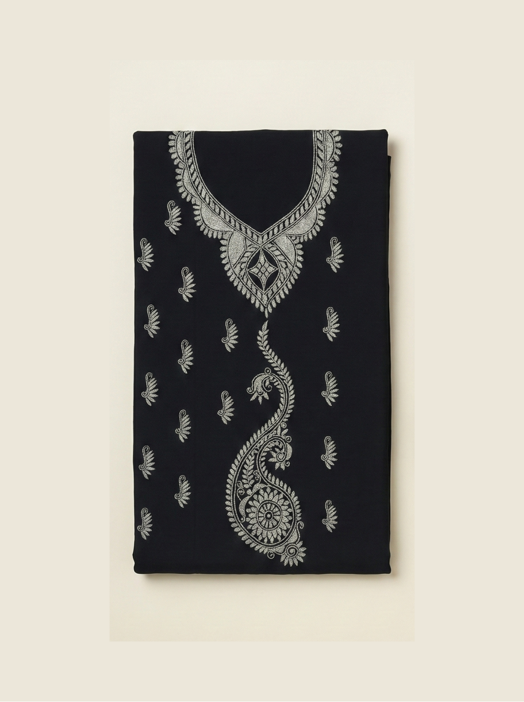 This luxurious Pure Silk Suit Material in classic black is a timeless blend of elegance and sophistication. Adorned with intricate thread embroidery, the fabric features beautifully detailed motifs arranged in a graceful cascading pattern along with delicate scattered designs throughout. The refined silver-toned thread work enhances the rich black silk base, giving the ensemble a striking and regal appearance.