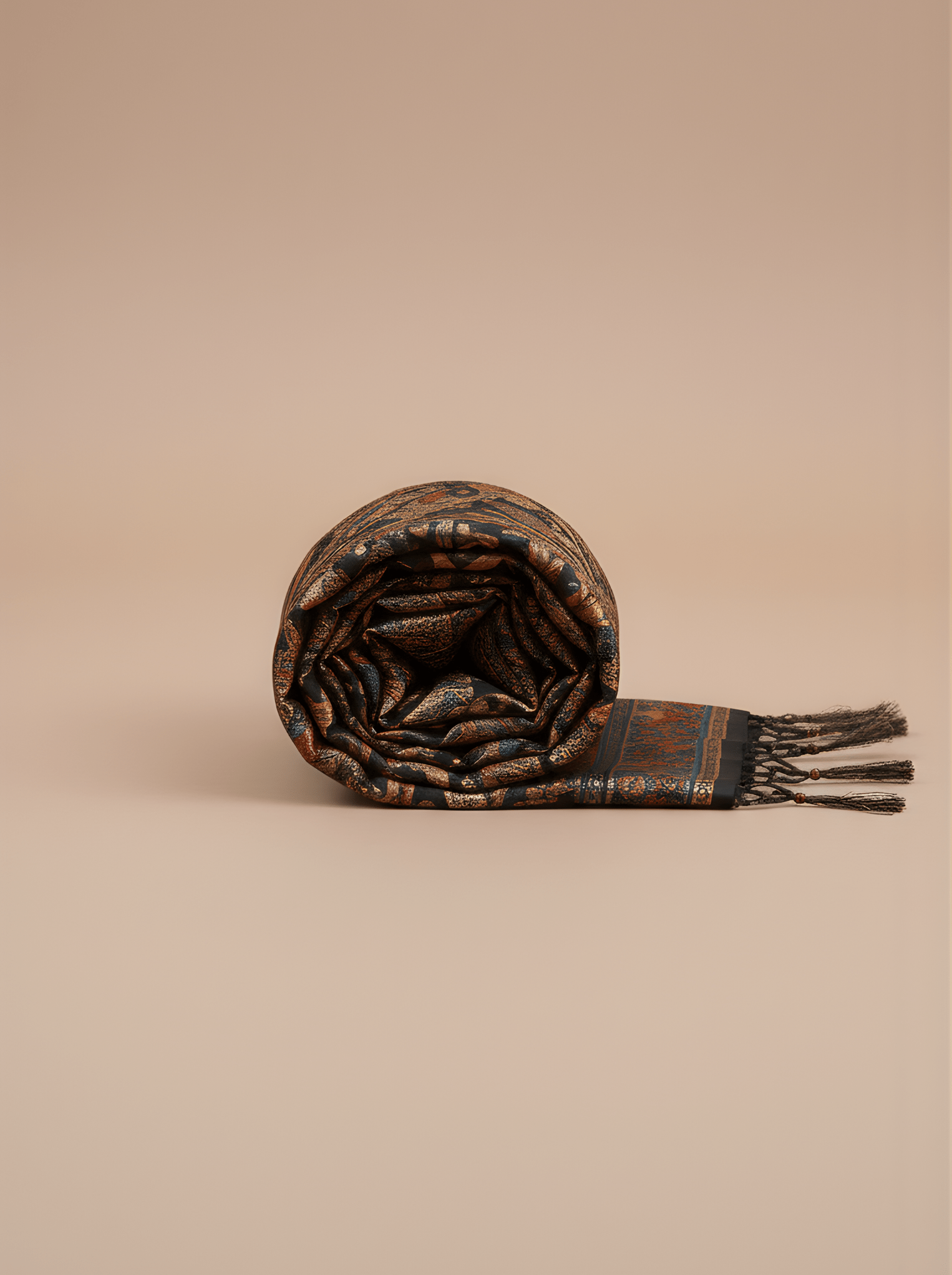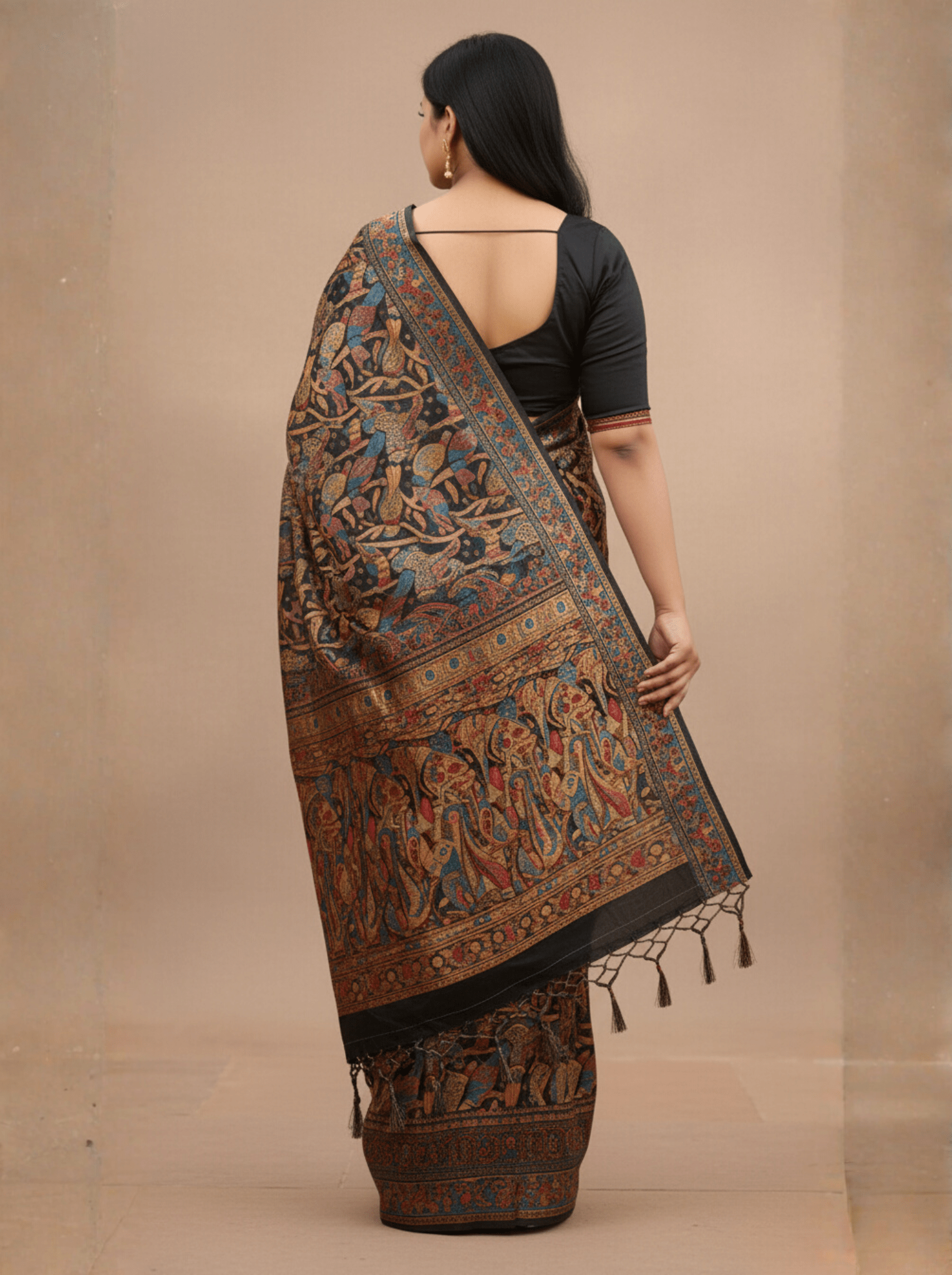 This exquisite saree is a stunning example of a Banarasi Silk masterpiece, crafted in a rich Black base highlighted with intricate multicolor Zari weaving. The body features traditional Banarasi brocade motifs inspired by Madhubani art, including stylized peacocks, florals, vines, and heritage geometric patterns. The saree’s grand ornate border is woven with deep Gold, Copper, Teal, and Red accents, creating a luxurious contrast against the black silk. The pallu is richly detailed with heavy weaving and finished with elegant tassels, adding a graceful drape and royal charm. Its lustrous silk texture and vibrant handcrafted detailing make this saree a sophisticated choice for weddings, festive occasions, cultural functions, and premium gifting.