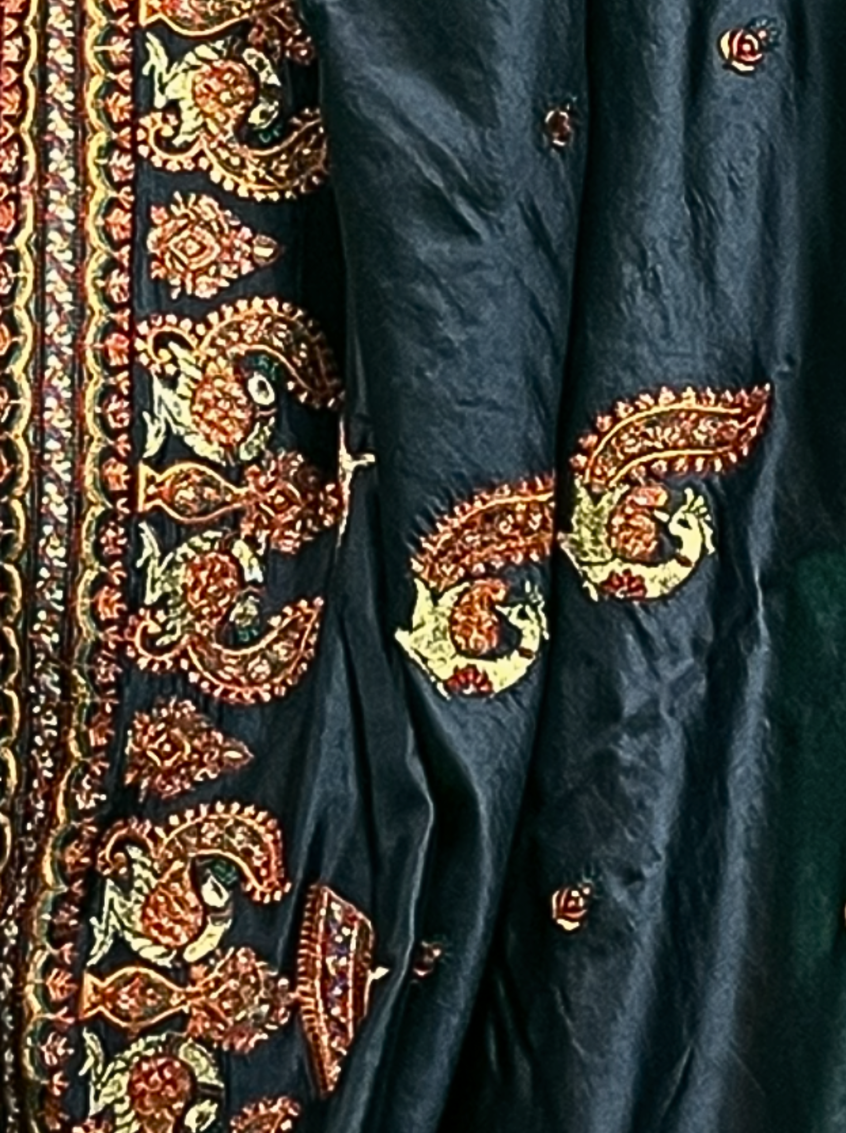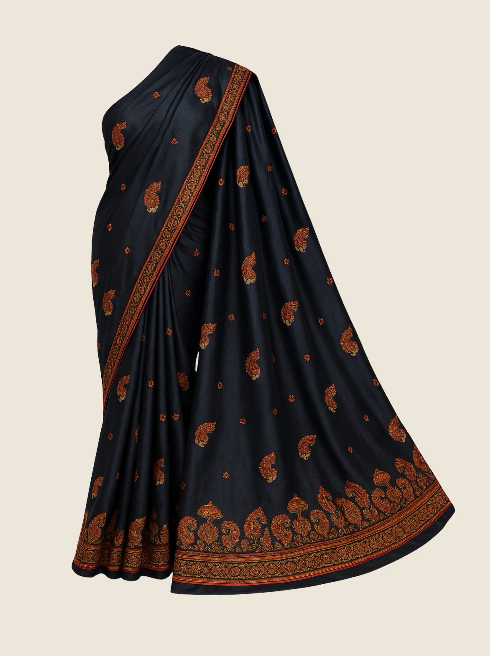 The finely detailed border and scattered paisley buttas add depth and opulence, while the natural sheen and fluid drape of mulberry silk create a regal silhouette with every movement. The harmonious blend of golden zari and warm resham tones against the black base makes this saree perfect for grand occasions where understated luxury speaks volumes.