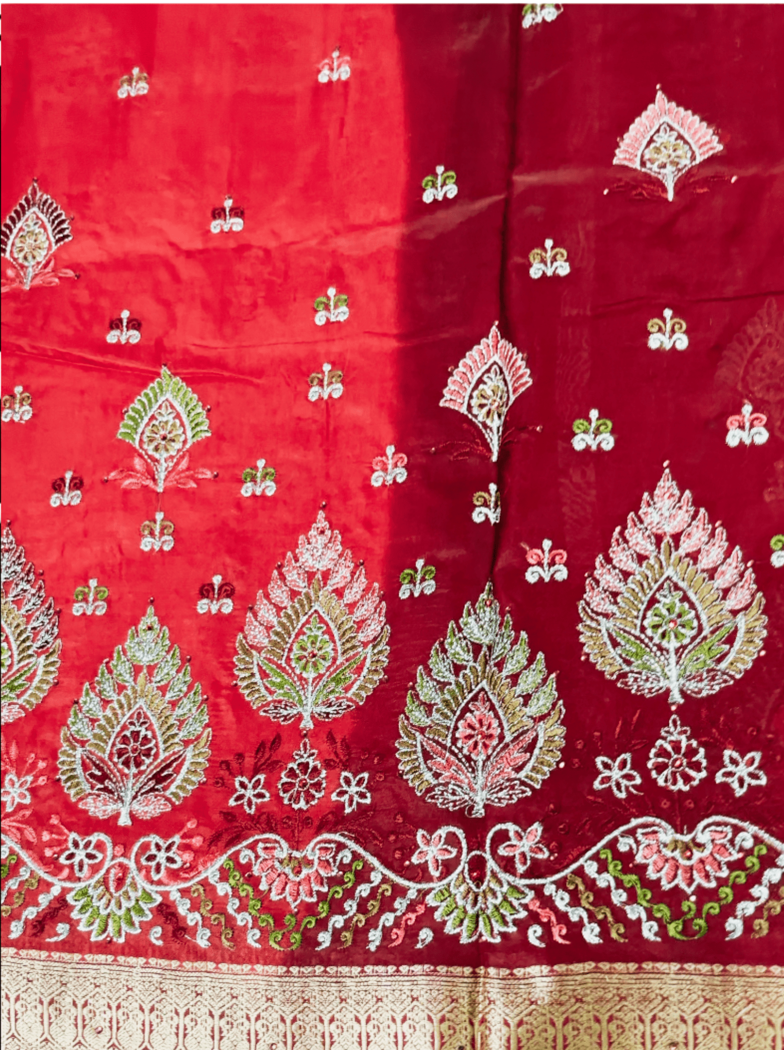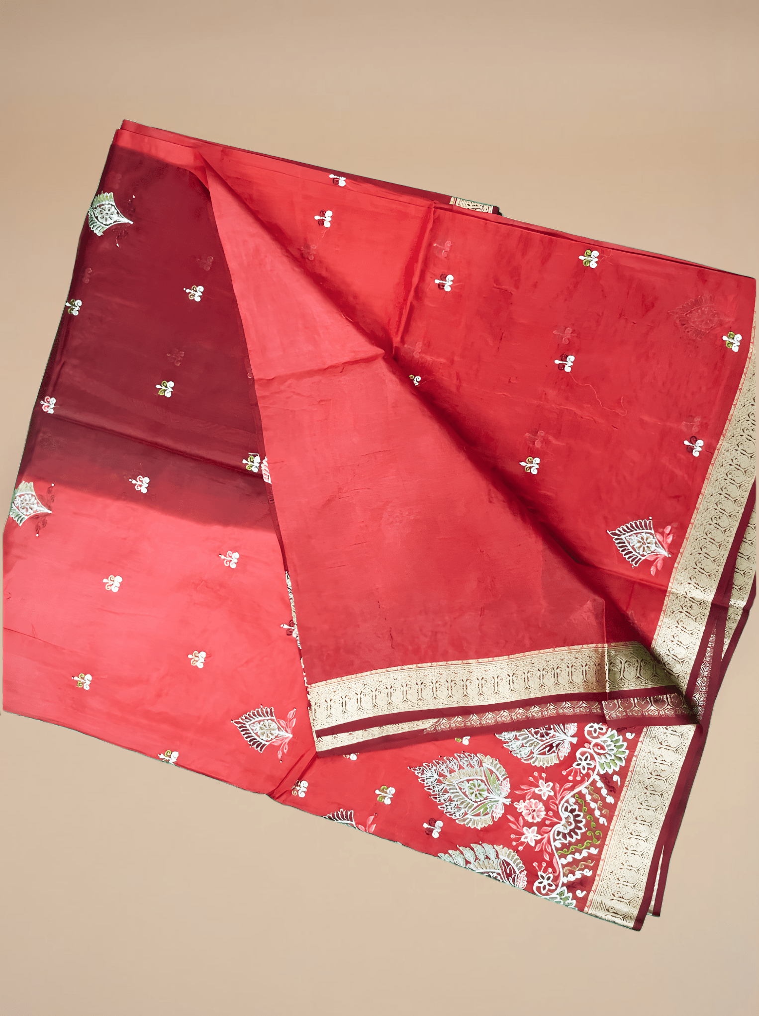 This luxurious dual-tone saree beautifully blends Cherry Red and deep Maroon, creating a rich festive look ideal for weddings, receptions, and traditional celebrations. The saree is adorned with full heavy Zari embroidery, featuring intricate floral and leaf motifs inspired by classic Indian craftsmanship. Its shimmering gold Zari border adds a regal touch, while the soft, smooth fabric drapes elegantly, offering both comfort and grandeur. Lightweight and premium, this saree is perfect for special occasions where sophistication is key.