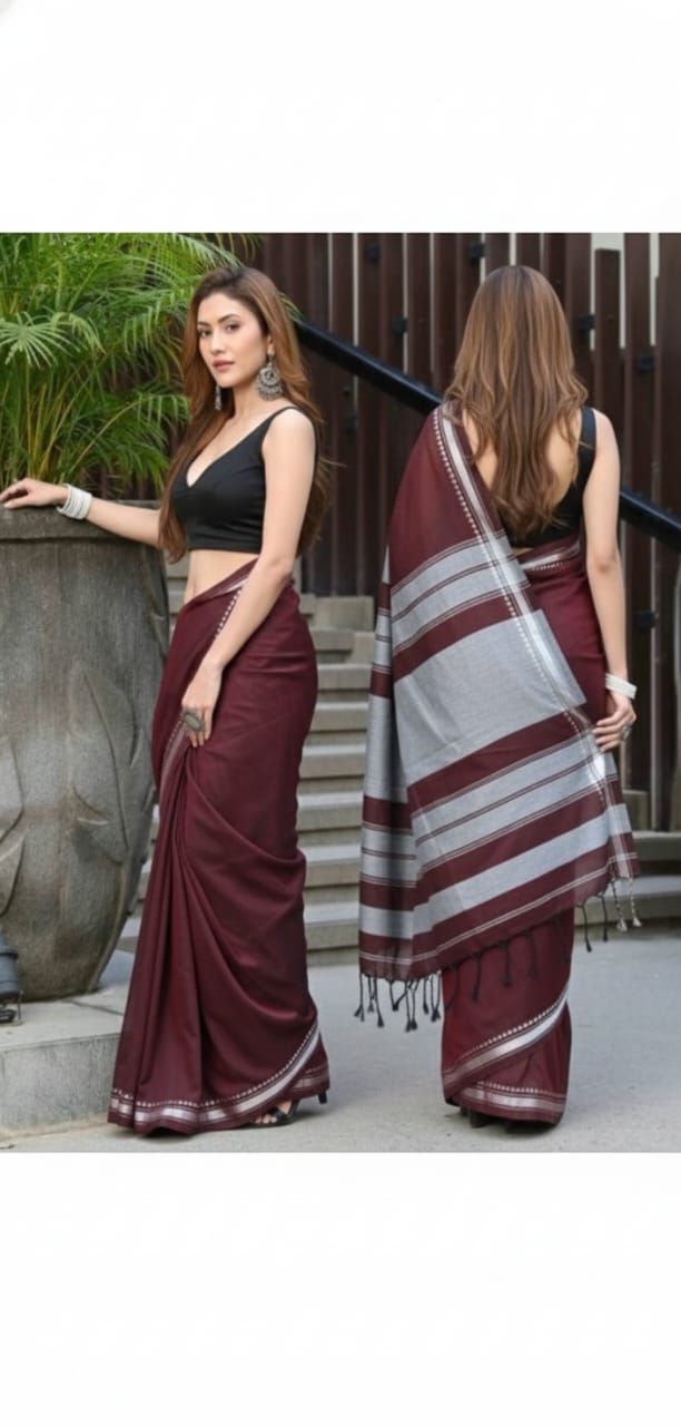This Handloom Cotton Saree beautifully blends richness and simplicity through its deep maroon/wine-colored body paired with a striking grey-silver striped pallu. Handwoven with care, the saree features a soft, breathable texture that offers a naturally crisp finish—ensuring a graceful fall and comfortable wear throughout the day.