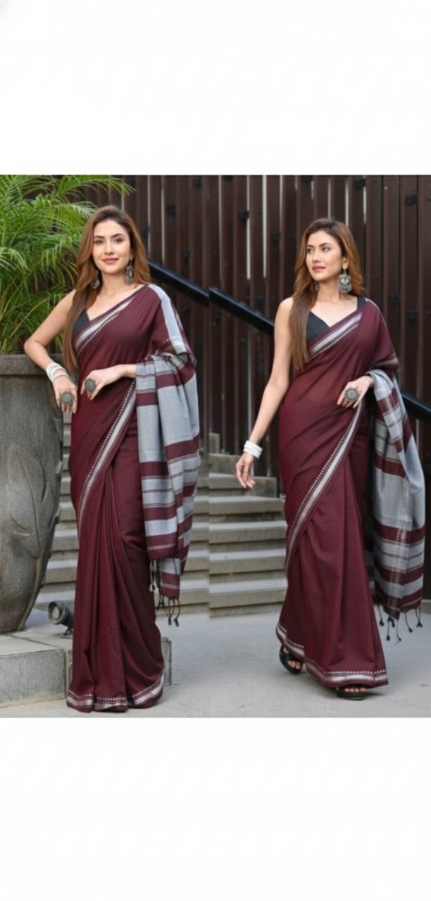 Be the first to review “Wine–Maroon Handloom Cotton Saree – Grey-Silver Striped Pallu | Woven Border | Elegant Textured Drape” Cancel reply