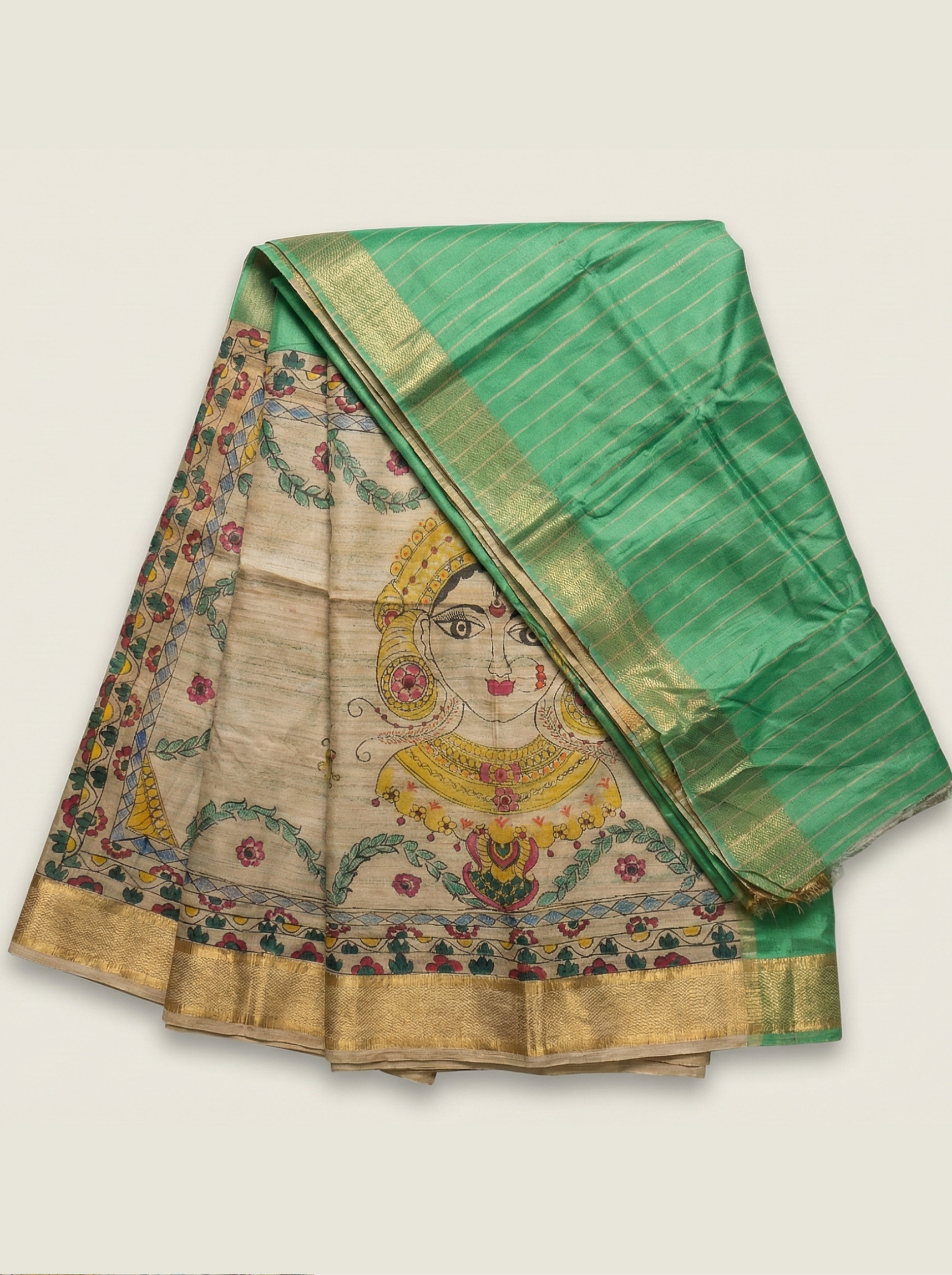 Crafted from premium Dhecha silk, the fabric carries a natural matte texture that enhances the vibrancy of the hand painting. The saree is finished with an elegant golden zari border, adding a touch of regal charm while balancing the artistic detailing. Lightweight, graceful, and culturally rich, this saree is perfect for festive occasions, cultural functions, weddings, and for anyone who appreciates artisanal craftsmanship.
