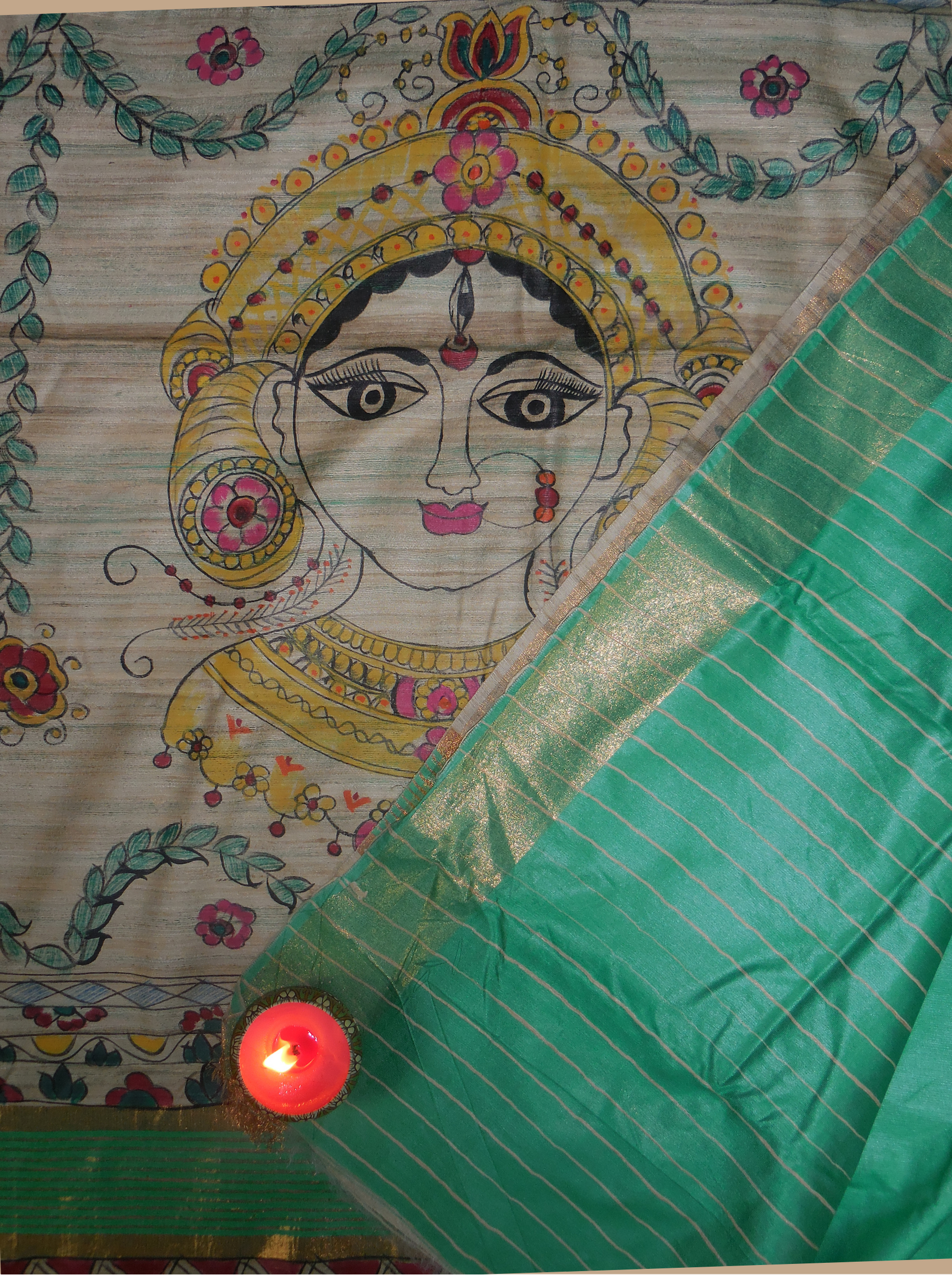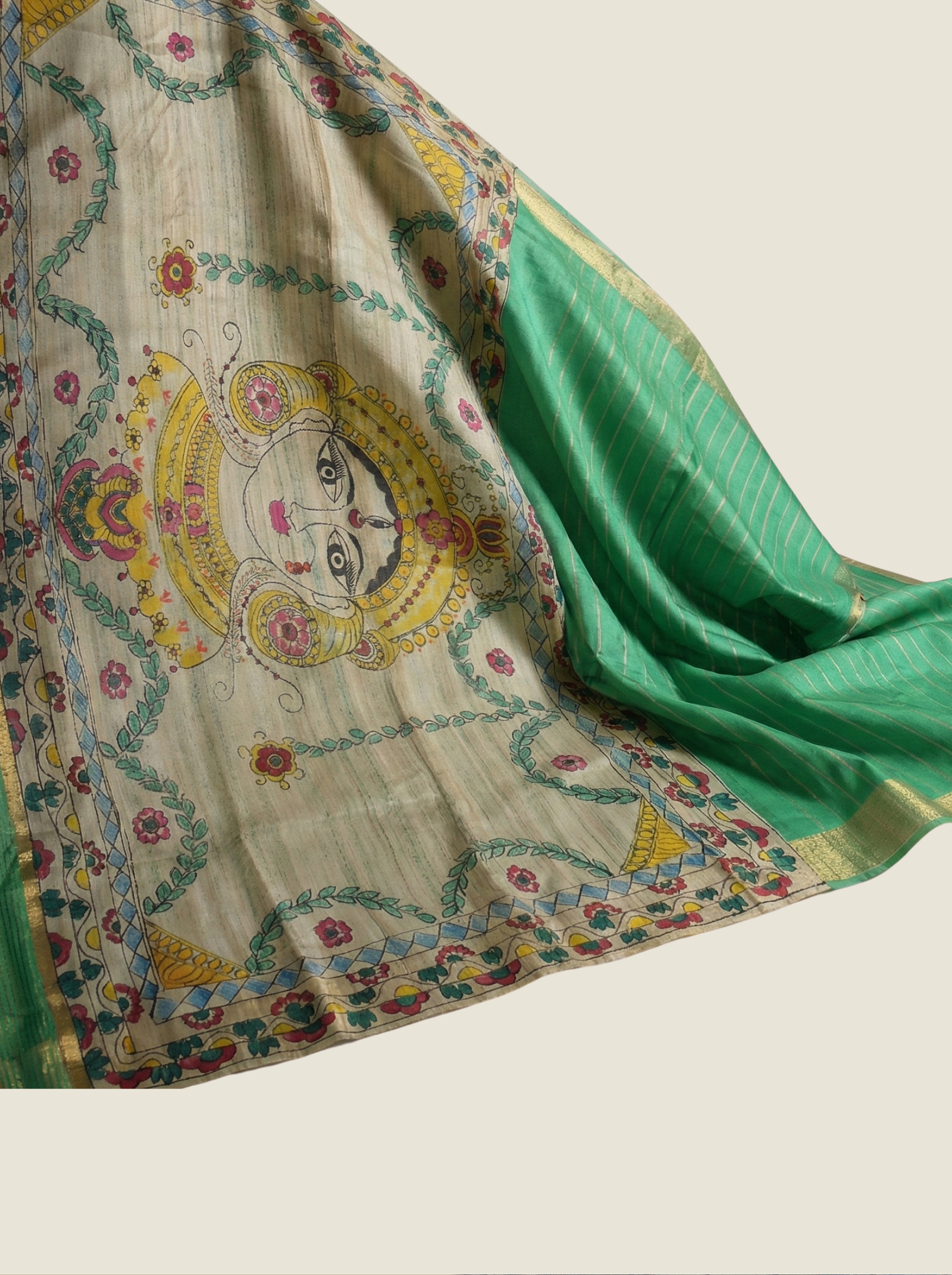 Dhecha Silk Saree with Handcrafted Mithila Painting & Zari Border