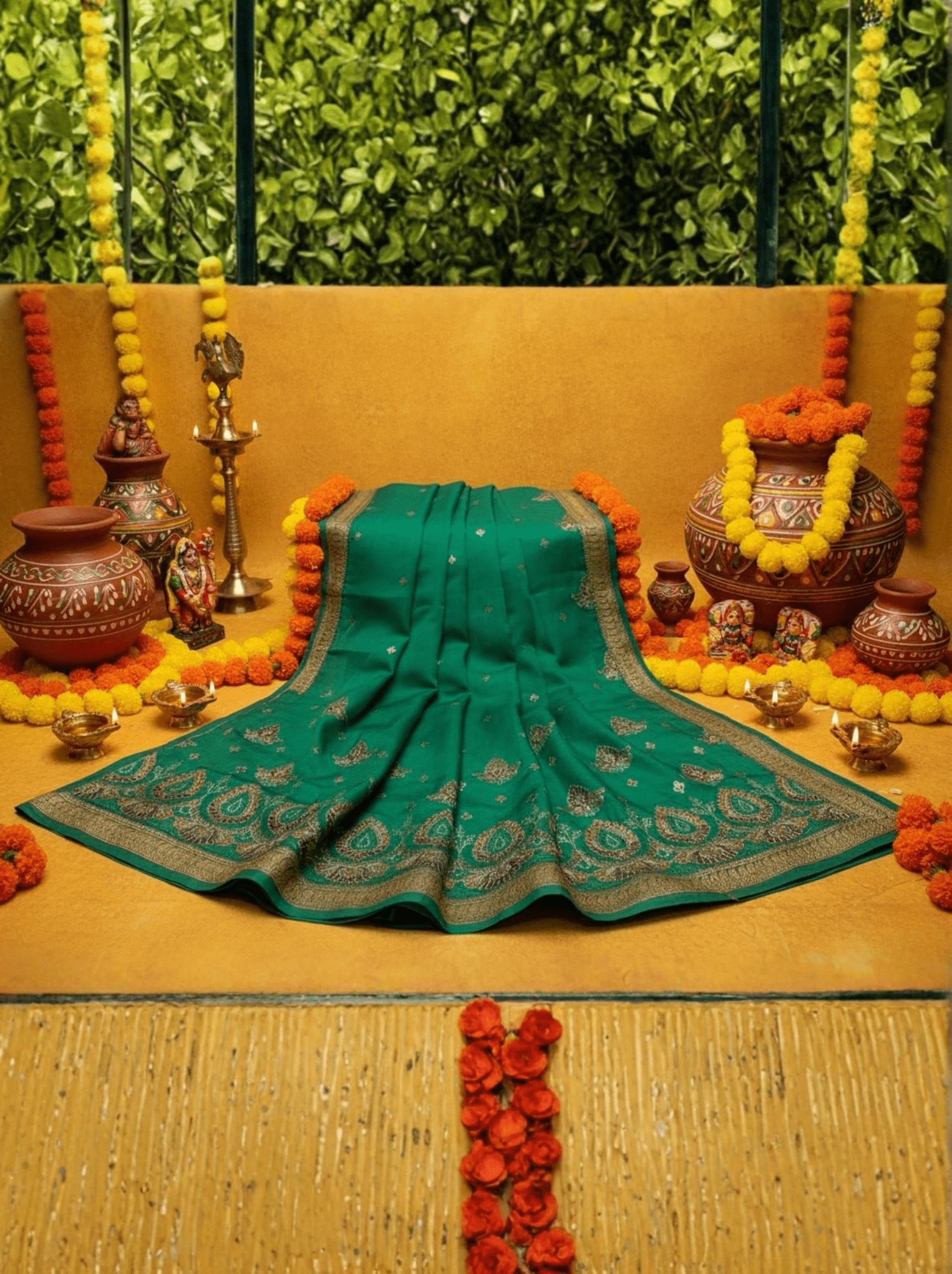 This exquisite Green Silk Saree is a timeless expression of elegance and traditional charm, crafted in luxurious pure silk with a rich emerald green body that radiates freshness and royal sophistication. The saree is beautifully enhanced with a traditional woven border, adding a classic touch that perfectly complements the vibrant green hue.