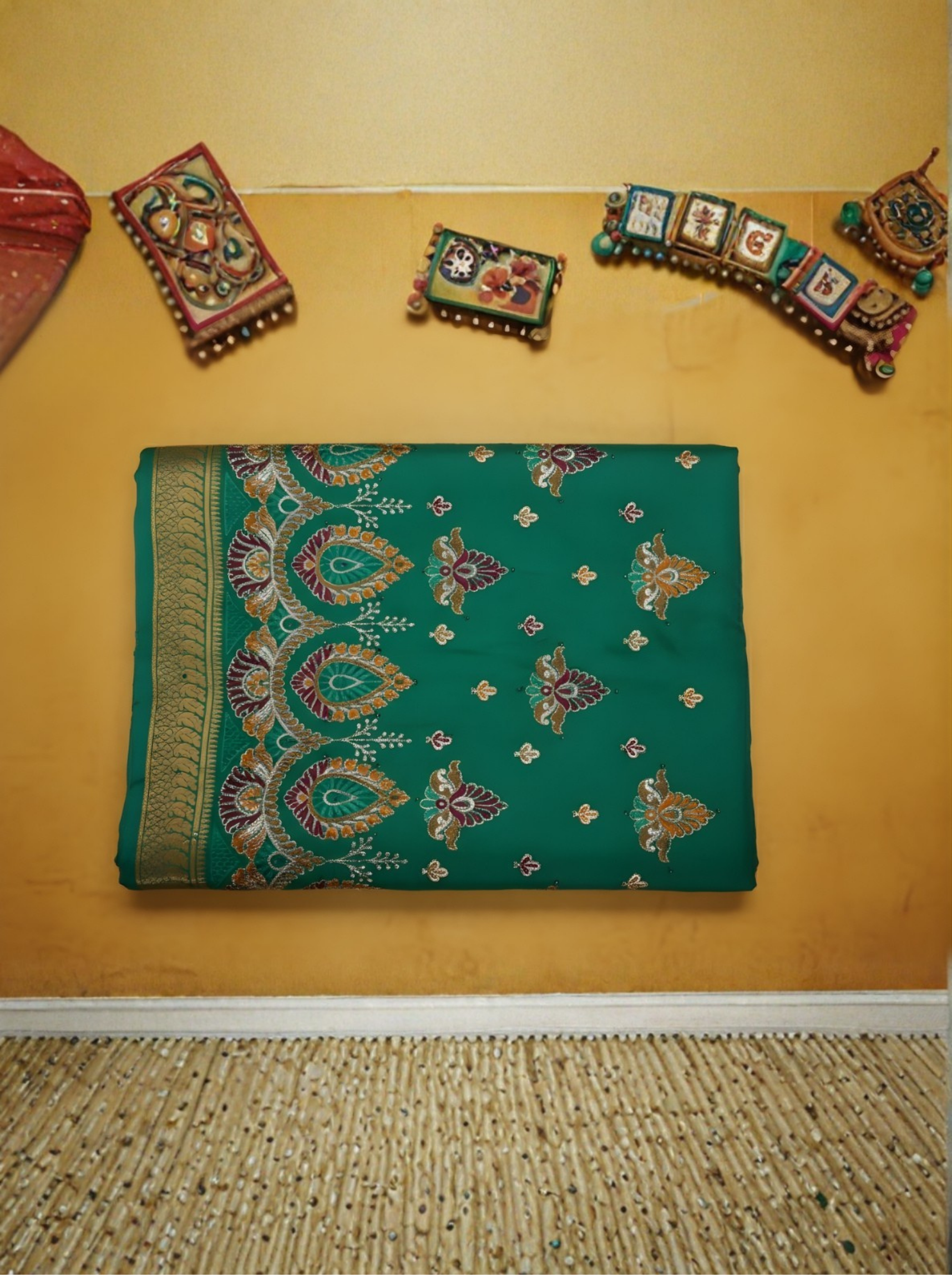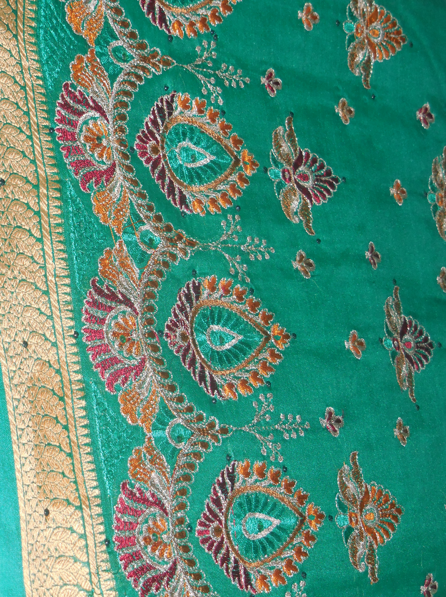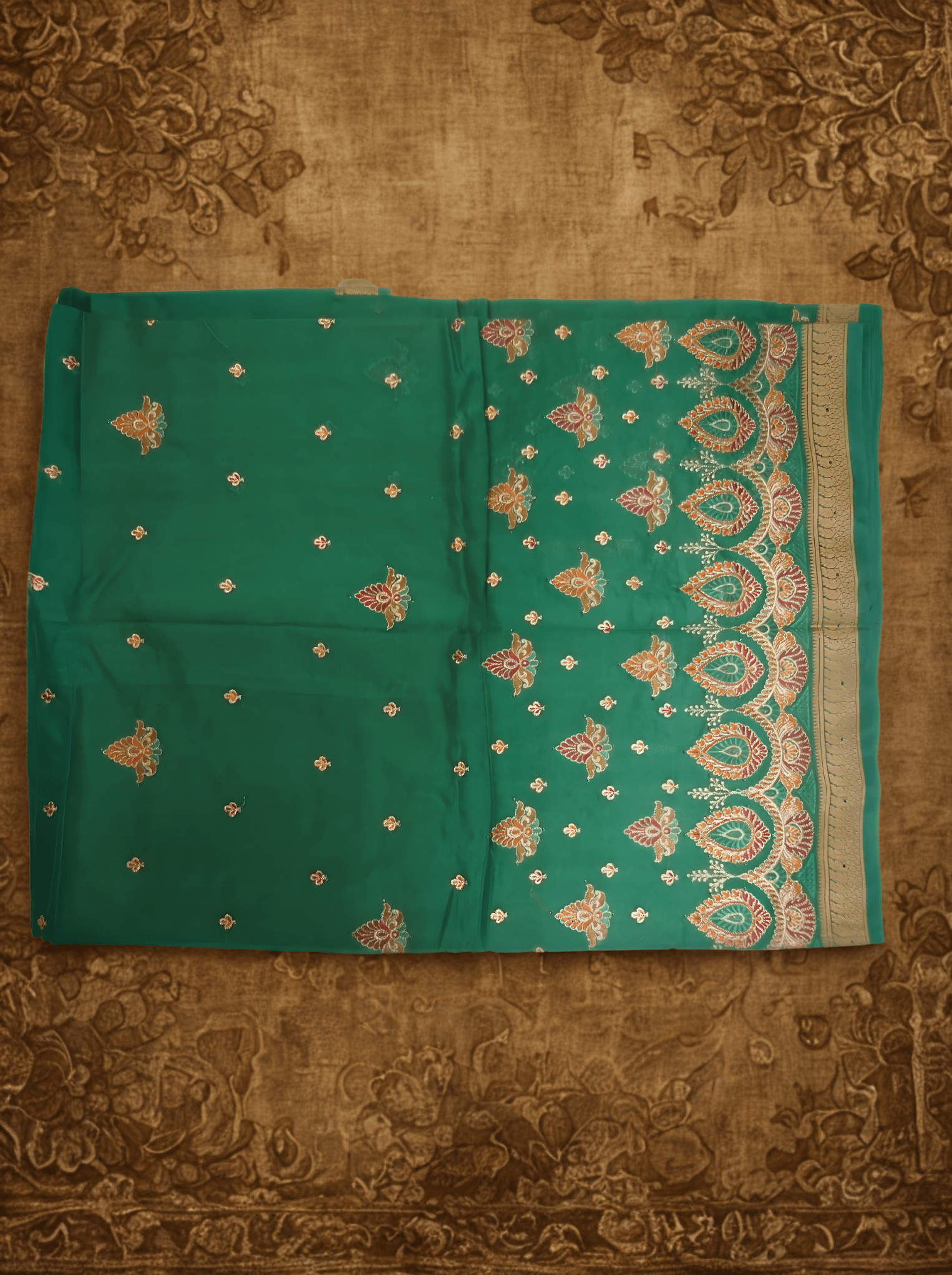 Be the first to review “Emerald Green Pure Silk Saree with Buti Work & Traditional Woven Border”