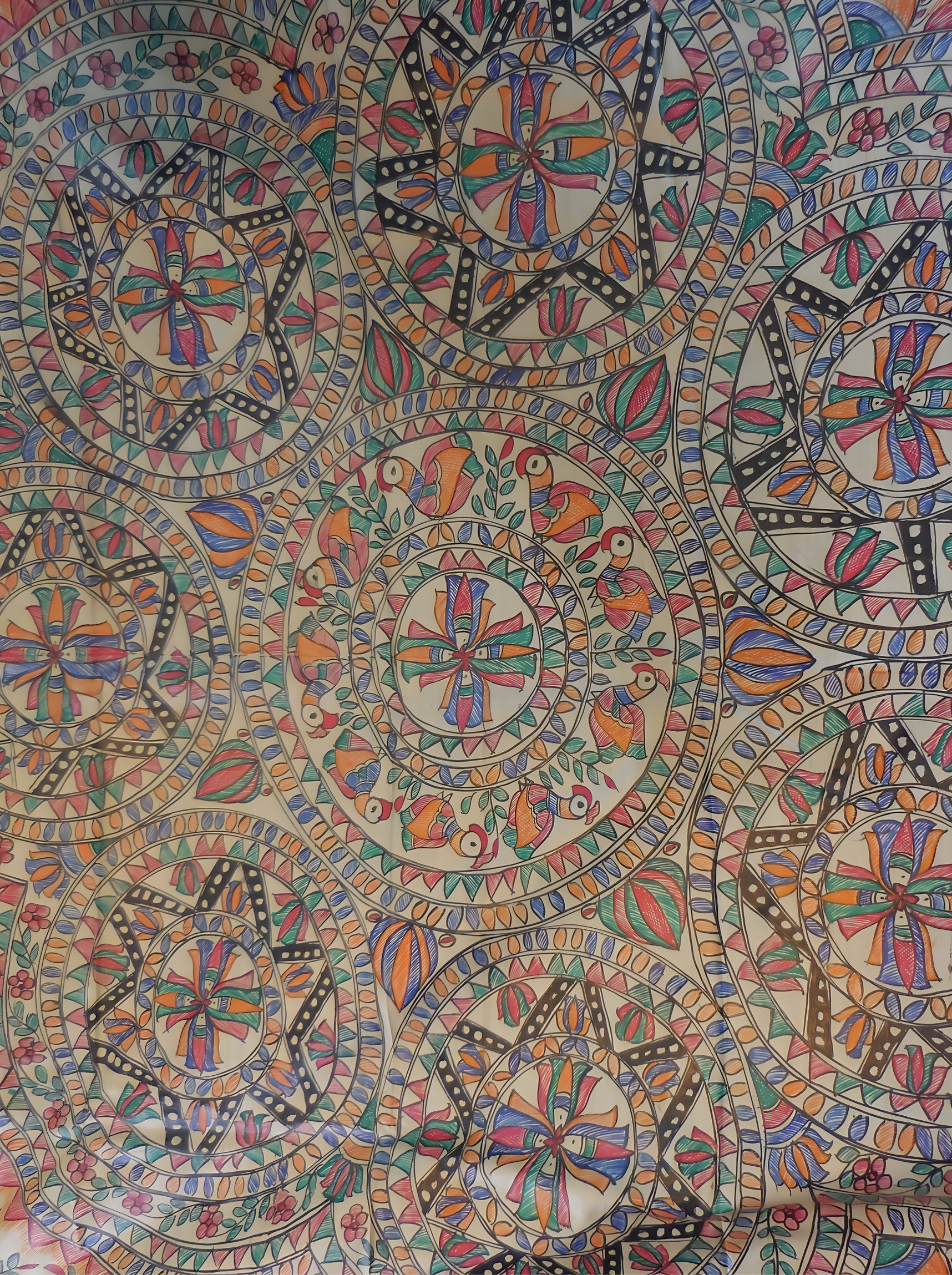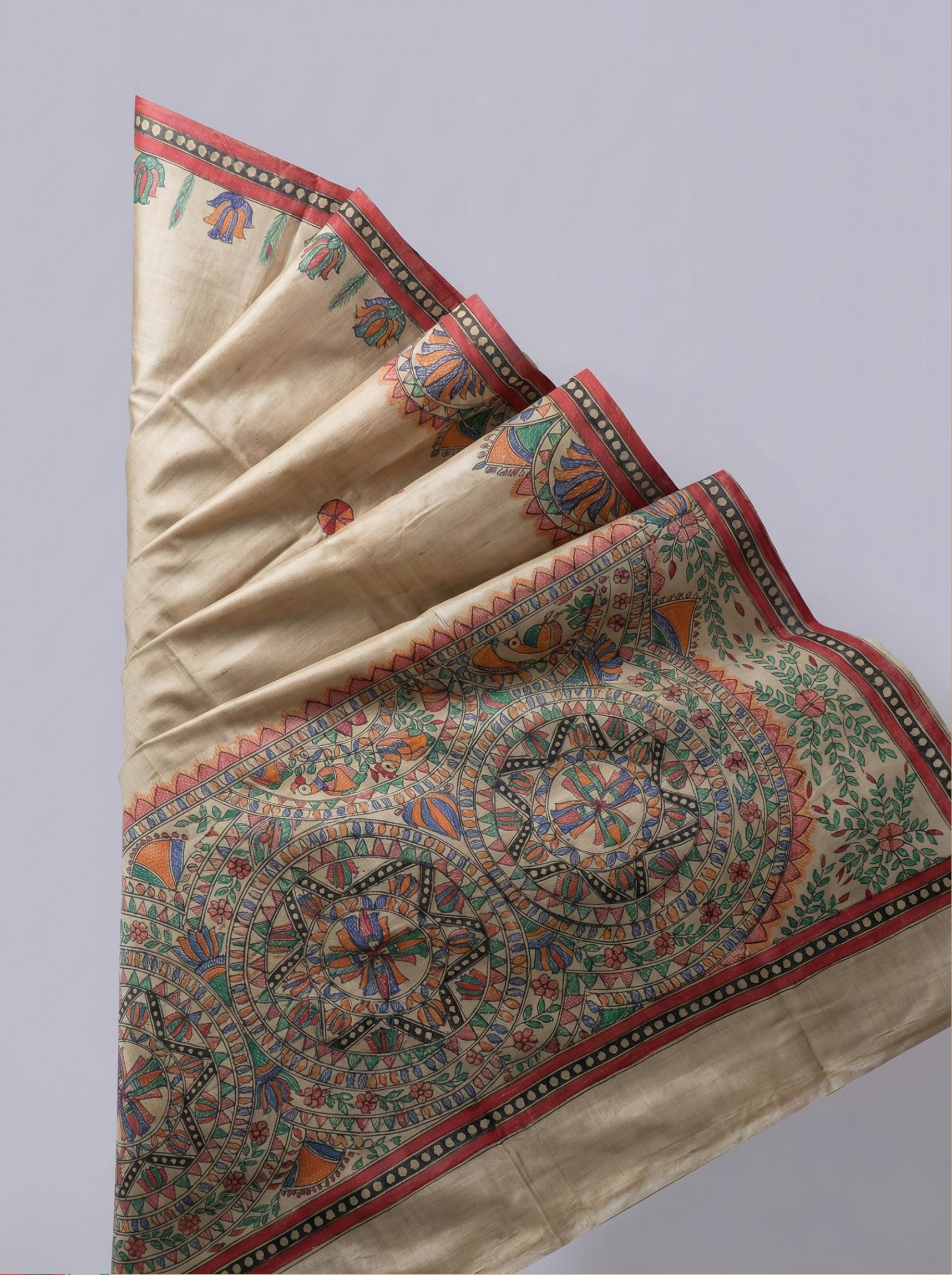 Pure Silk Madhubani Saree in Butterscotch Cream (Hand-Painted Mithila Art)