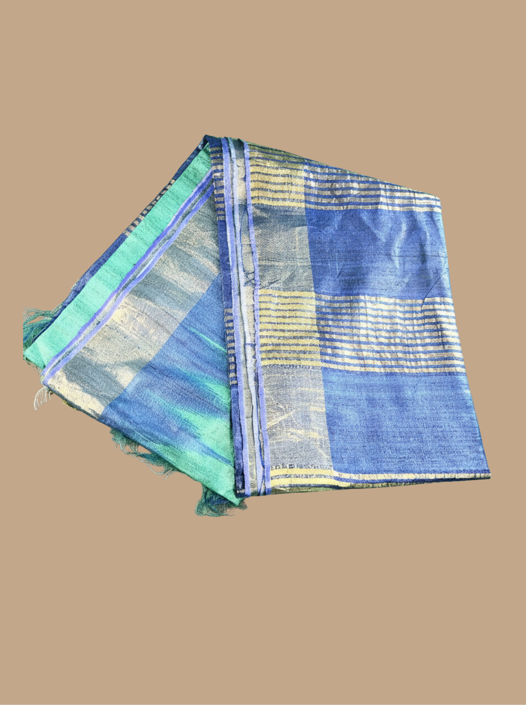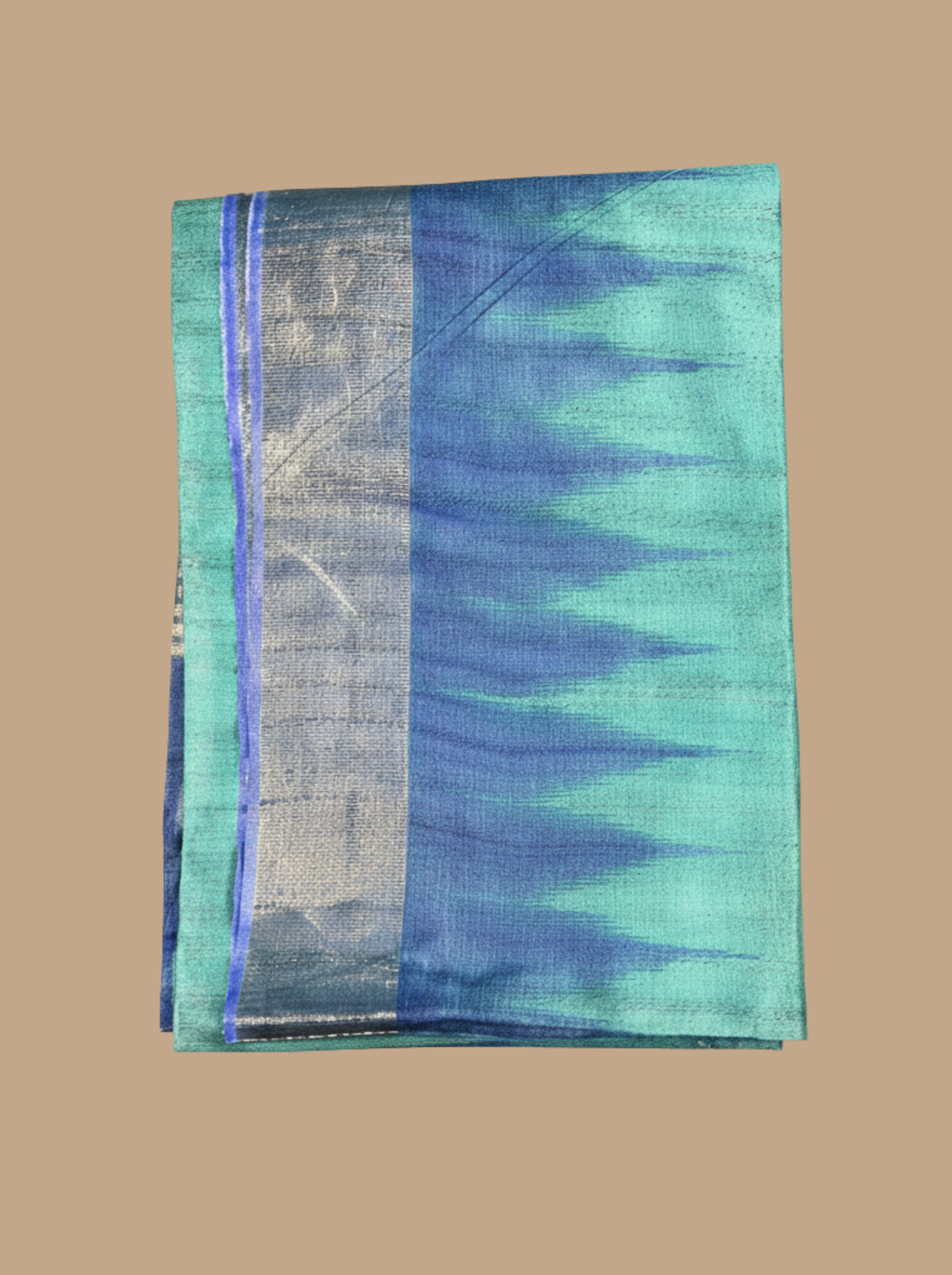 This exquisite Pure Tussar Ghicha Silk Saree is a masterpiece of handwoven elegance, crafted to highlight the natural beauty and rich texture of authentic Tussar silk. The saree features a captivating pyramid sequence pattern that blends beautifully with the luxurious dual-tone palette of deep Royal Blue and Teal/Sea Green, creating a visually stunning gradient effect.