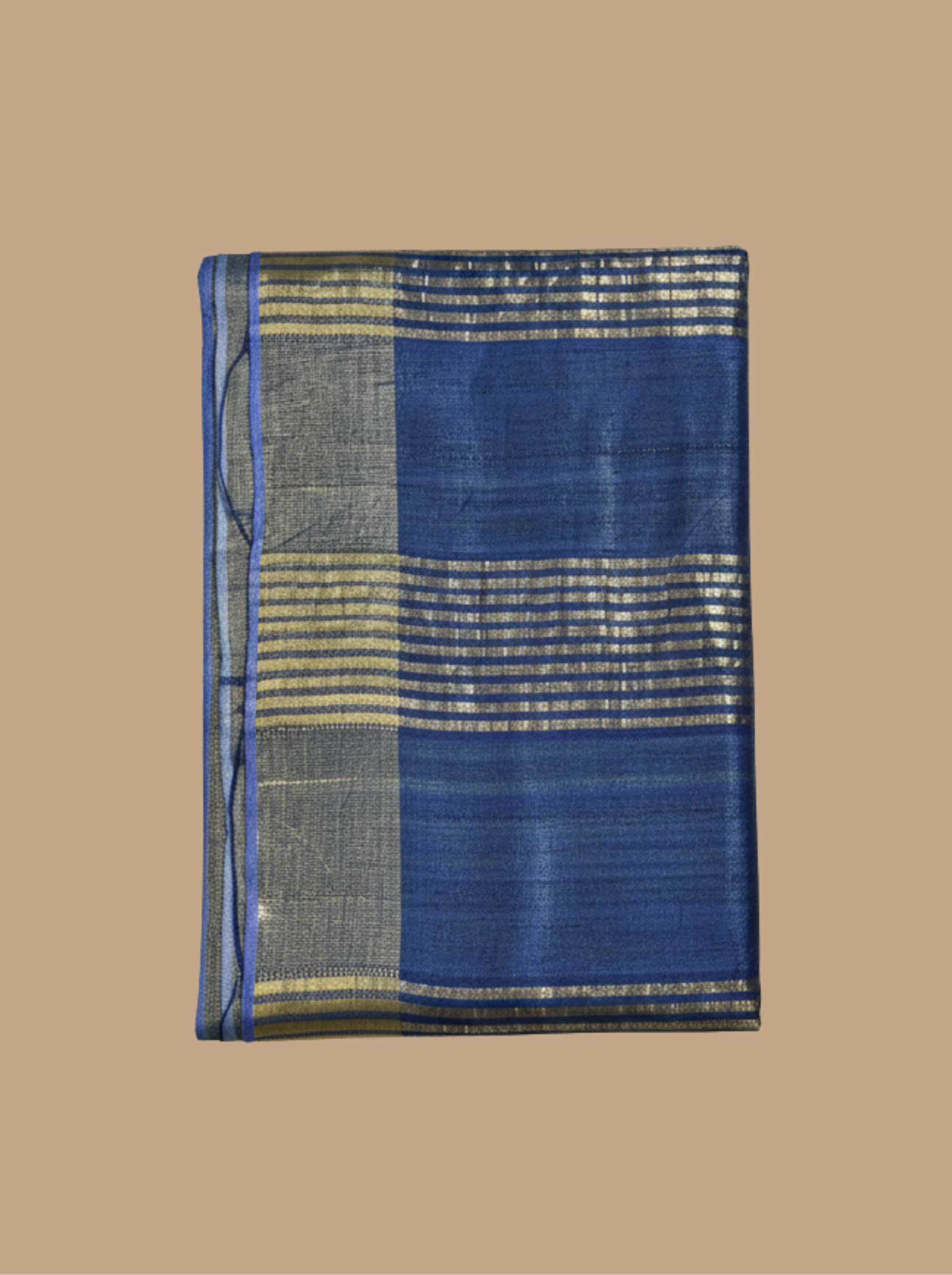Pure Tussar Ghicha Silk Saree in Royal Blue & Teal with Golden Zari Border