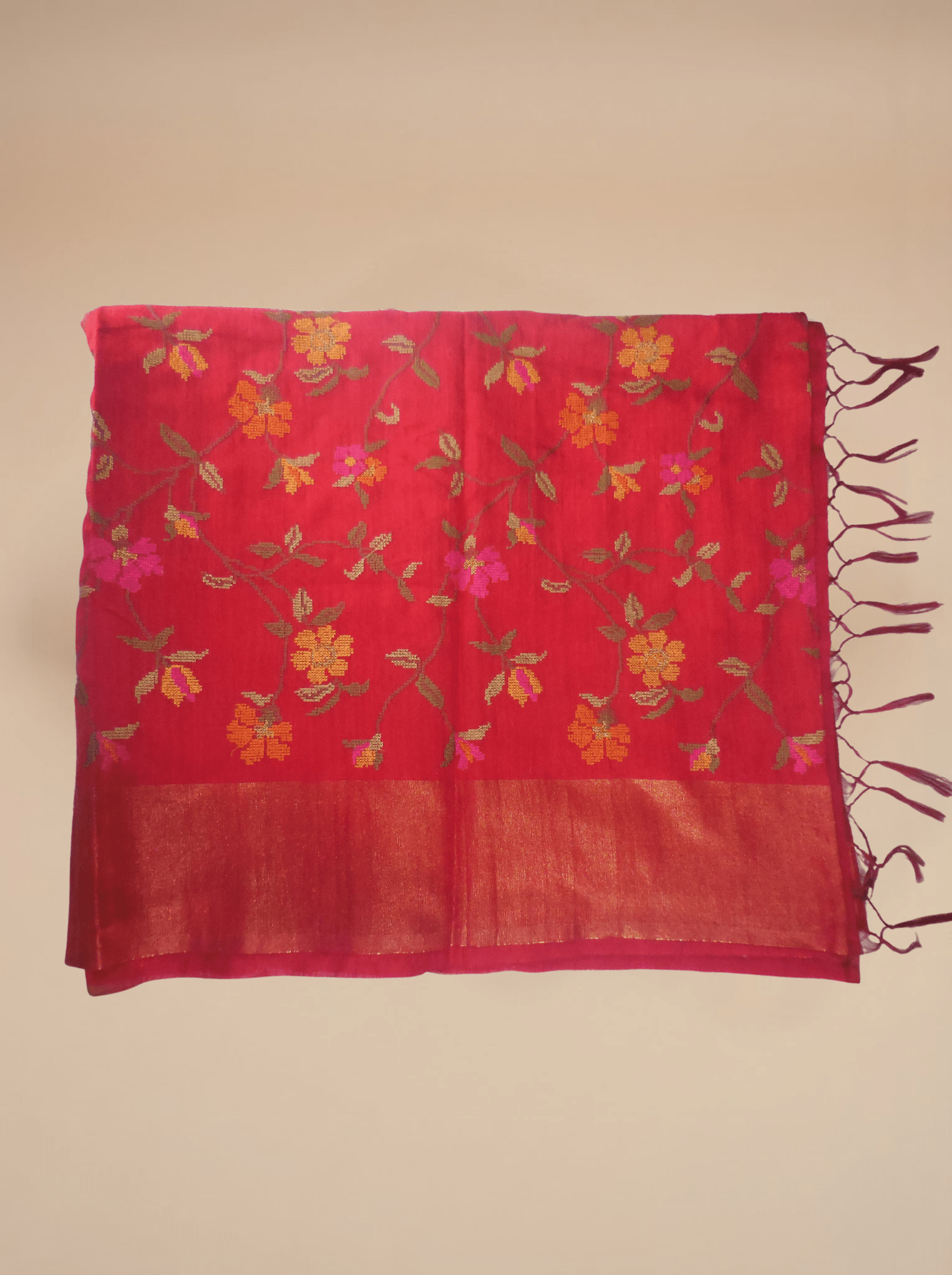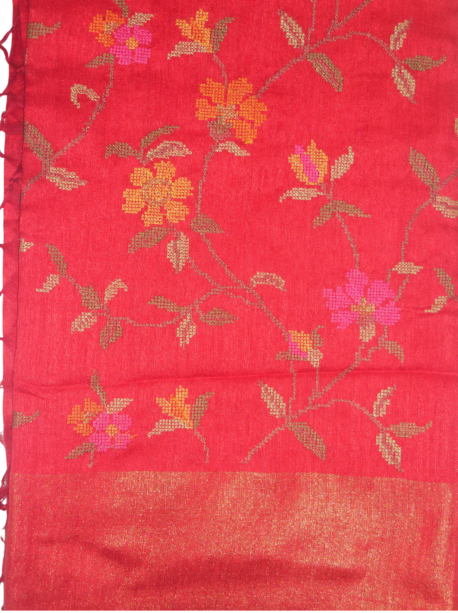 Tomato Red Musky Khadi Silky Cotton Saree with Full Thread Embroidery